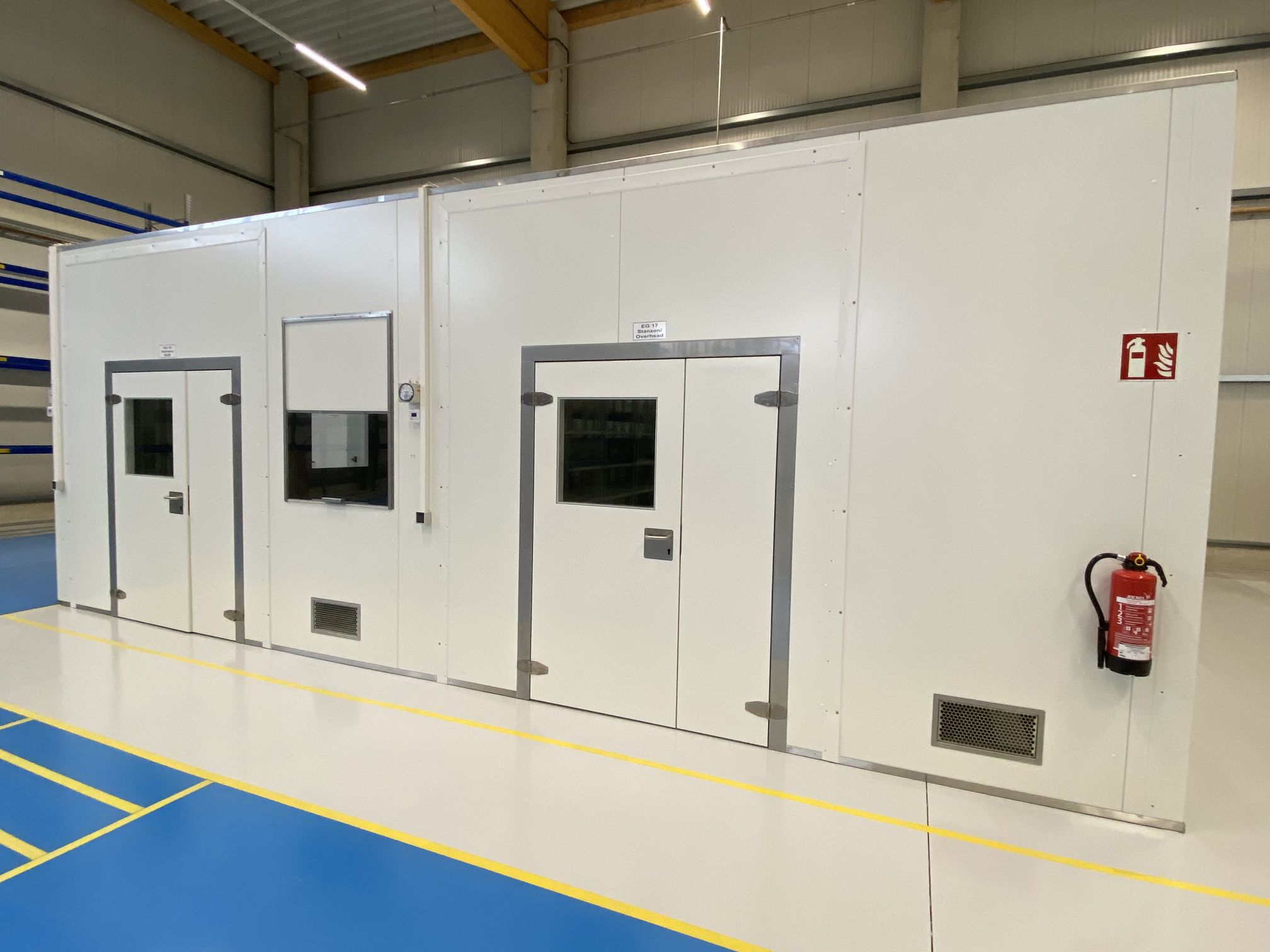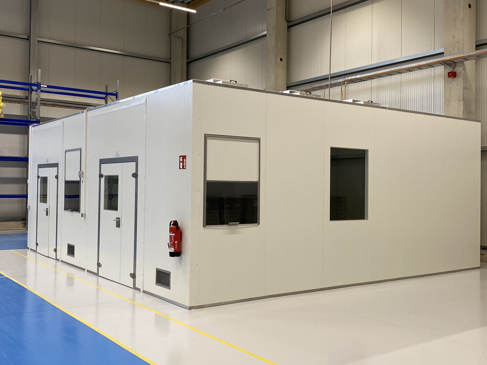 Multifunktional ausgeführte Reinraumkabine in Form einer hochwertigen Raum-in-Raum-Lösung, ausgelegt nach ISO 8 gemäß EN ISO 14644 (Klasse 100.000 nach abgel. US Federal Standard 209E, Klasse D gemäß GMP Leitfaden Annex II), ohne Personen- und Materialschleuse.