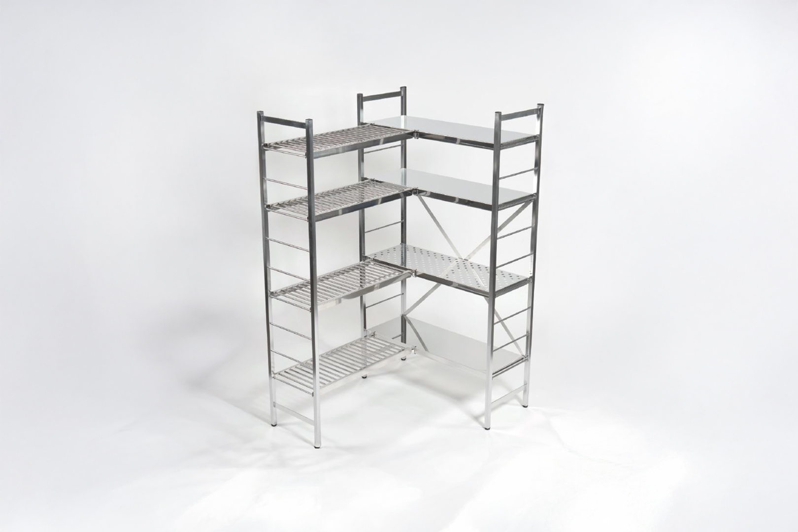 Freistehendes, gestecktes Regal aus Edelstahl.