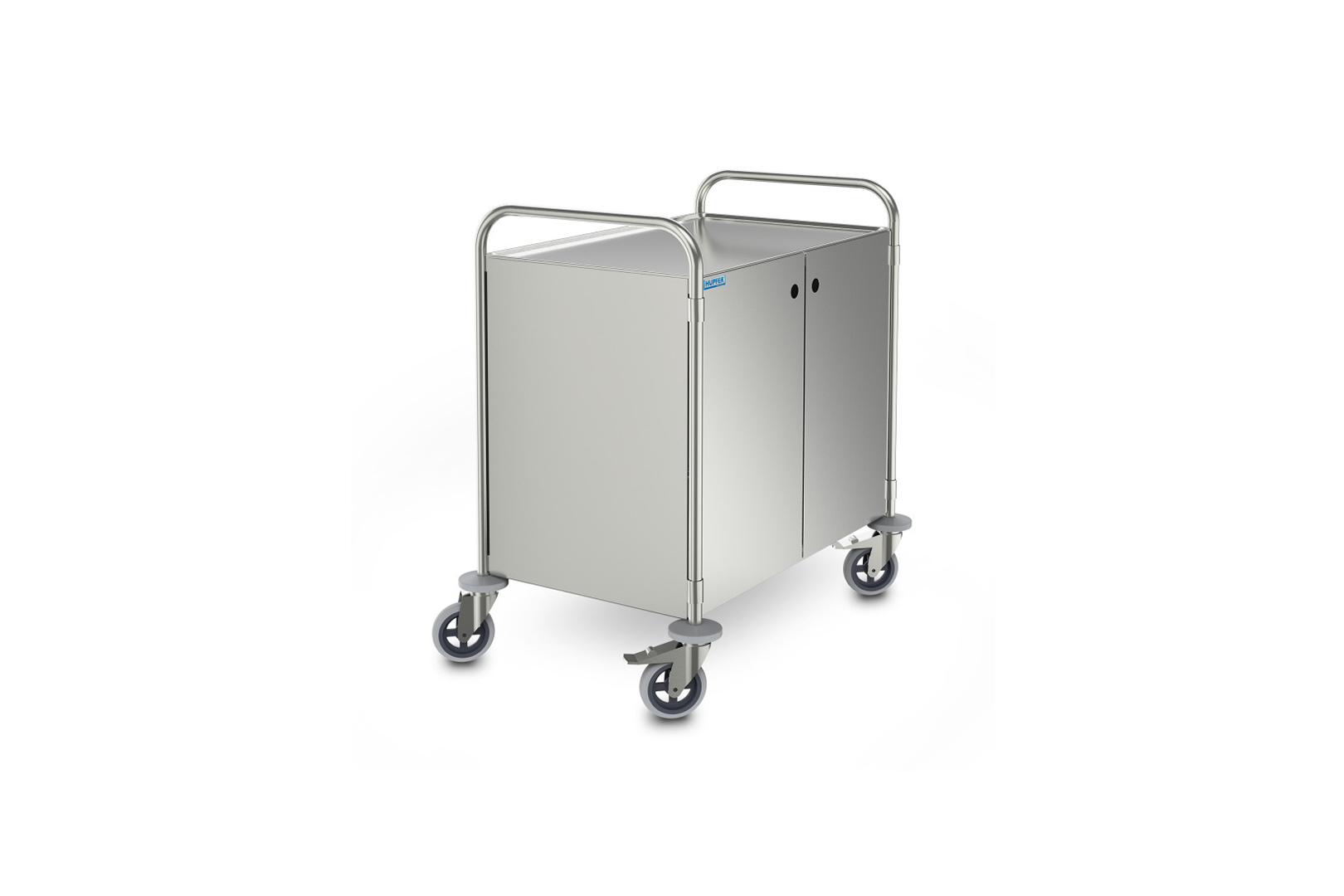 Geschlossener Etagenwagen in stabiler, selbsttragender und hygienischer Konstruktion aus Edelstahl.
