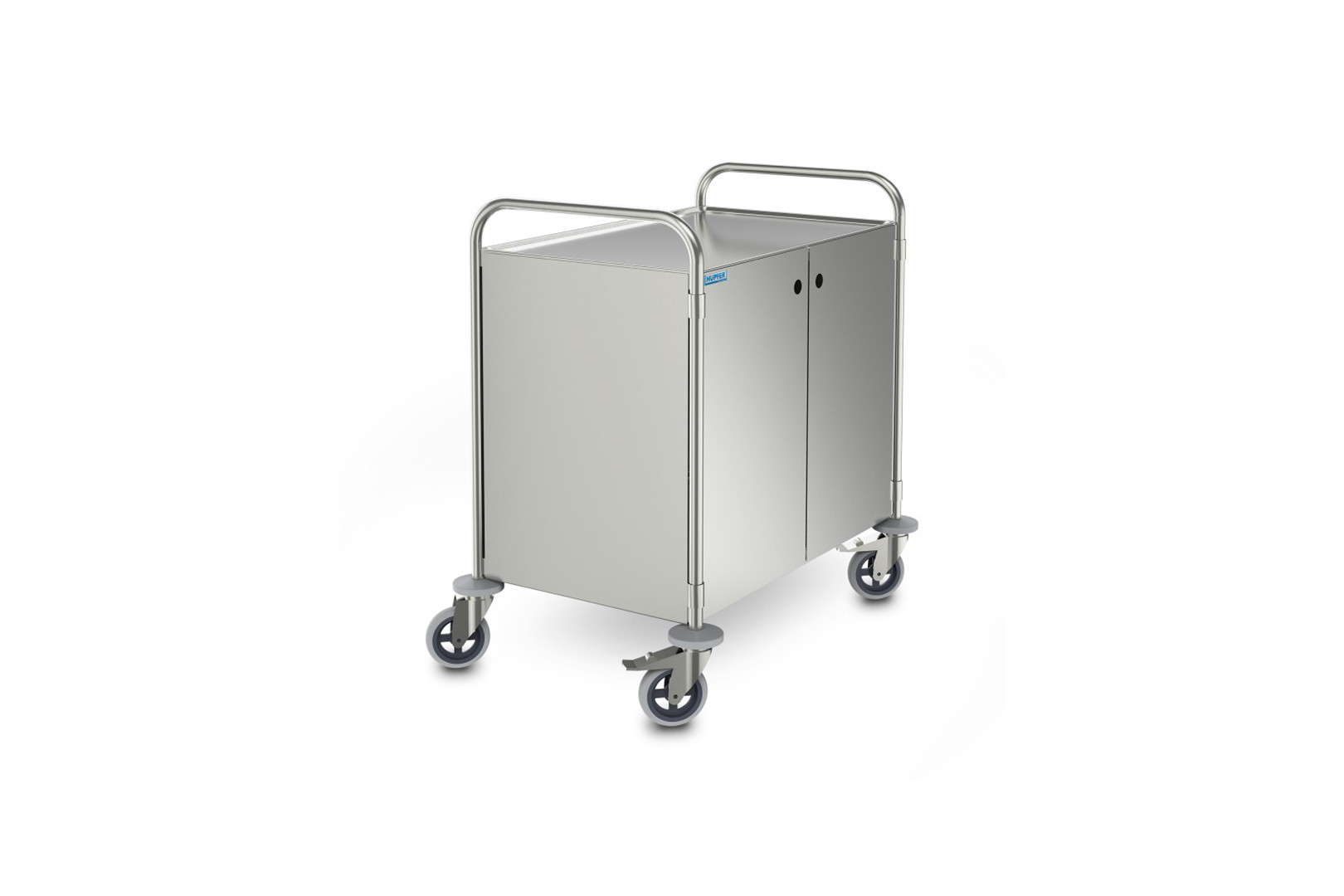 Geschlossener Etagenwagen in stabiler, selbsttragender und hygienischer Konstruktion aus Edelstahl.