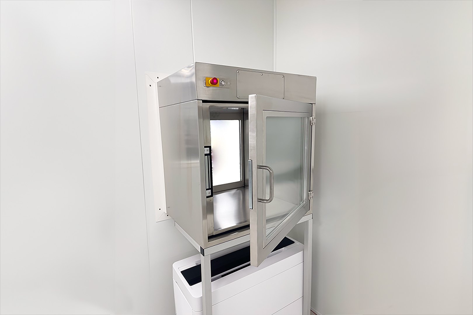 Materialdurchreiche für den Wandeinbau. Korpus aus Edelstahl, doppelwandig in luftdichter Bauweise.