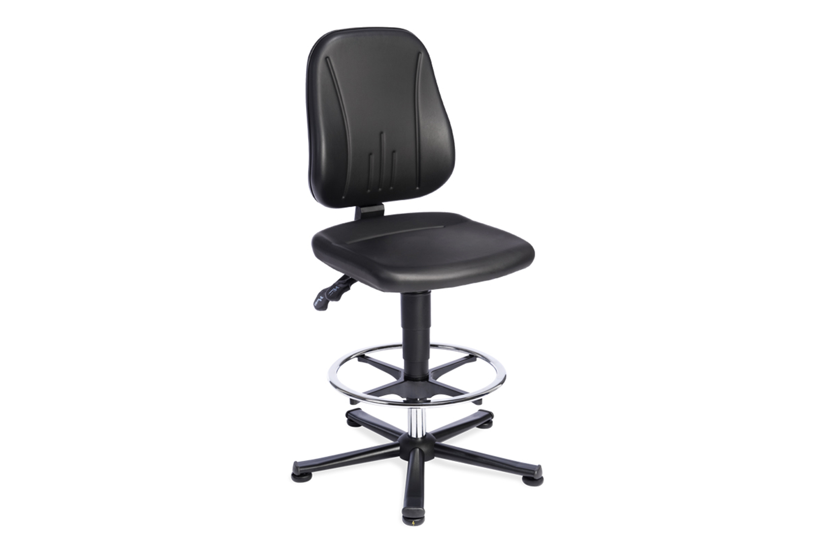 - Der Sitz ist mit einer nahtlosen Polsterung aus ESD-leitfähigem Kunstleder ausgestattet, das besonders reißfest und rutschhemmend ist
