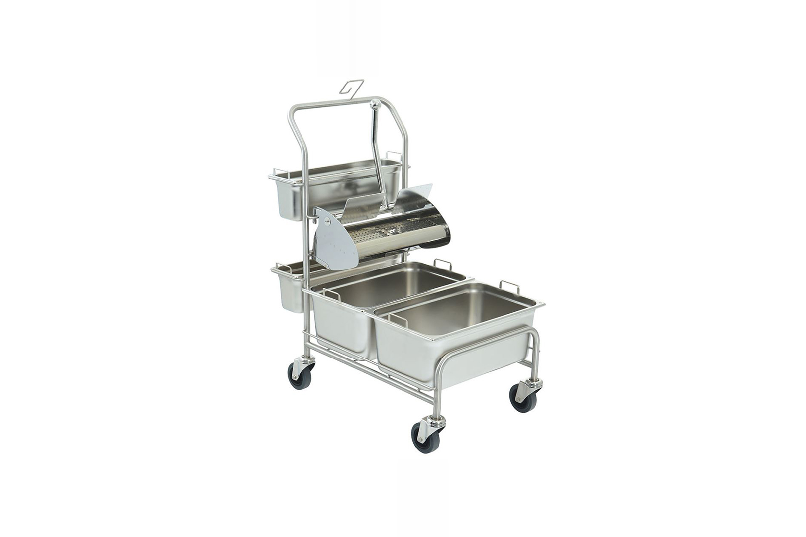 Edelstahlreinigungswagen mit Flachpresse, für hochsensible Bereiche mit minimalem Platzbedarf.