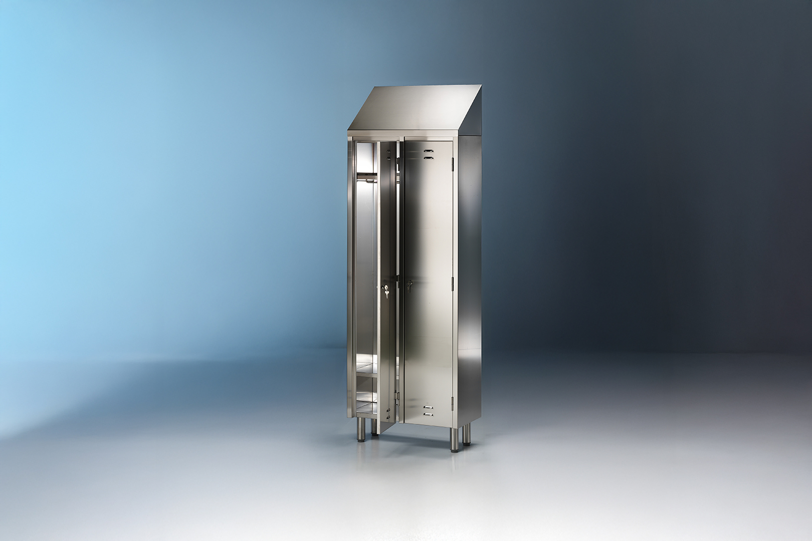 Aufbewahrungsschrank aus Edelstahl mit einer Flügeltüre: Solide Konstruktion in ausgezeichneter, handwerklicher Verarbeitung. Langlebig und stabil.